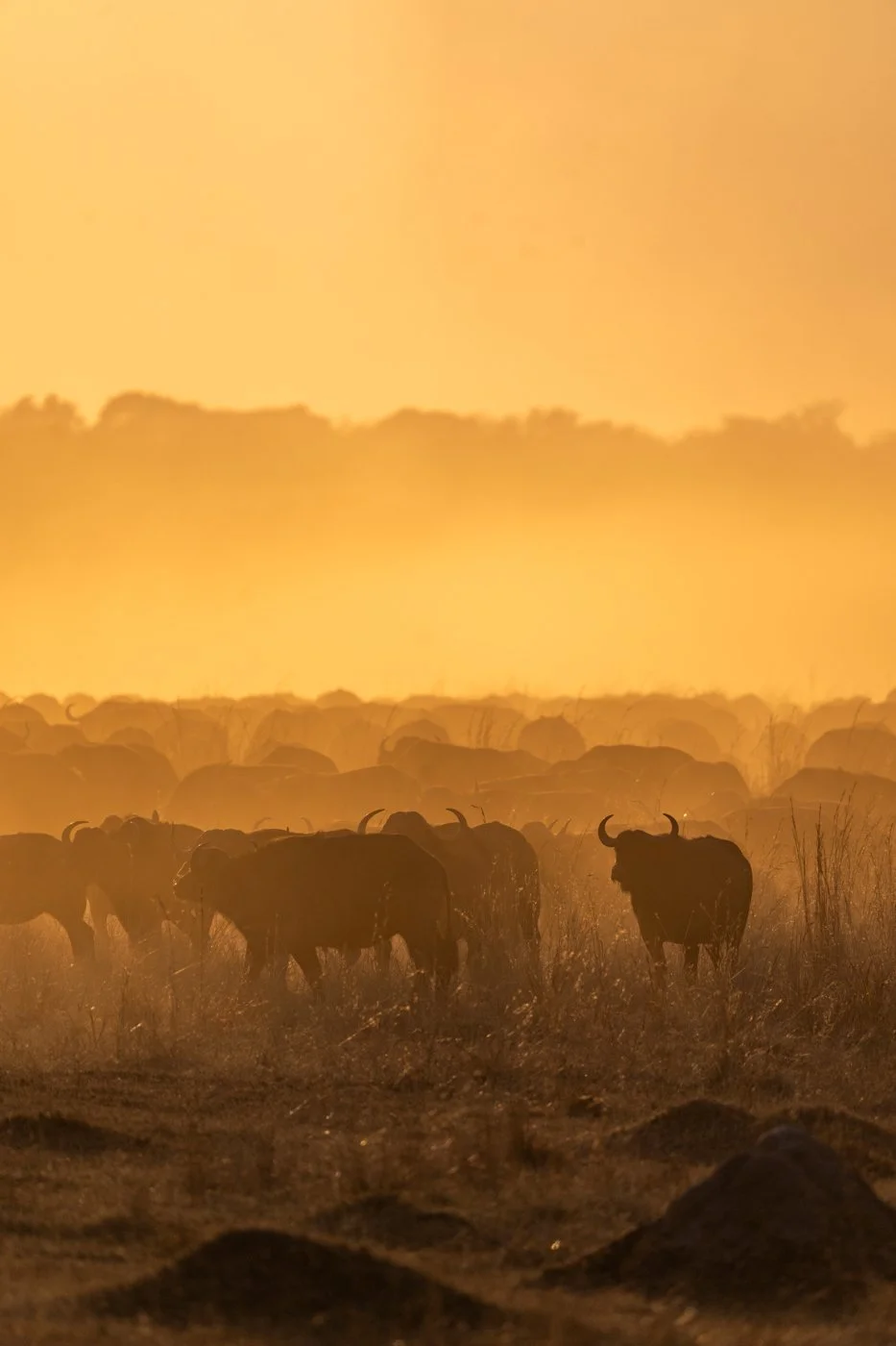 Growls and grunts dominate the air on this particular morning; the hunger of lions is palpable. A pride of ten has taken down a buffalo calf, and we find them huddled in a circle feeding, the only part of the calf visible a hoof sticking into the air. One of the females pauses and looks up at me, her face covered in blood.